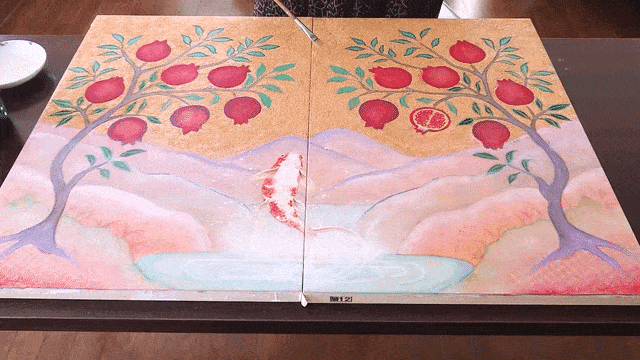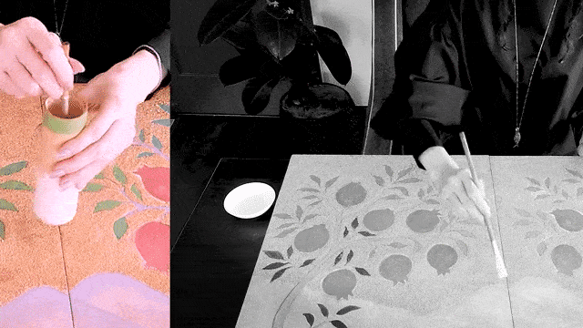 制作の核となるのは、天然石を微細に粉砕した鉱物顔料の使用である。蝋燭の灯りや反射光にかすかに煌めくその質感は、画面に妖艶で繊細な光彩を宿す。重ね塗りによって生まれる色彩は、生命のリズムと時の痕跡を体現し、各作品に静寂と生命力を同時にもたらしている。